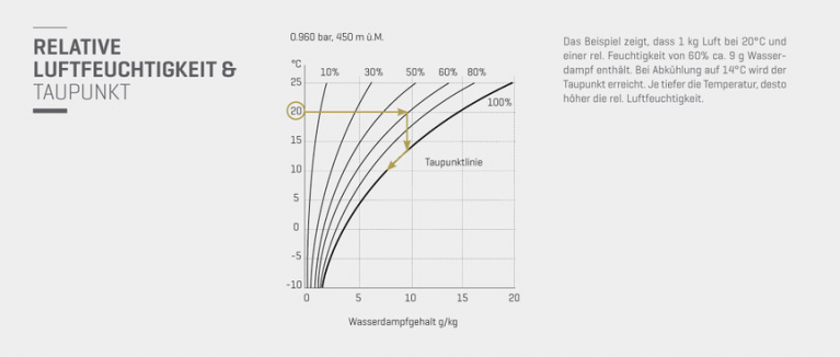 Kühlen wir diese Luft auf 16°C ab, steigt die relative Luftfeuchtigkeit auf 80% an. Sie enthält aber immer noch 9.2g Wasser pro kg Luft. Erschaffen wir nun eine kalte Oberfläche, die wir auf unter 12°C abkühlen, steigt die Luftfeuchtigkeit auf 100% an. Der Wasserdampf beginnt zu kondensieren, wir sprechen vom erreichten Taupunkt.